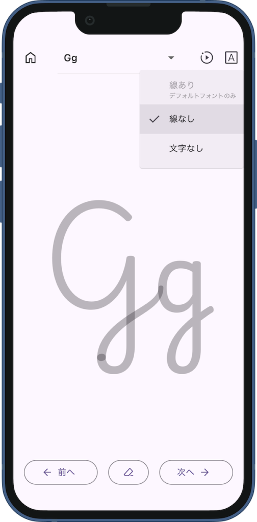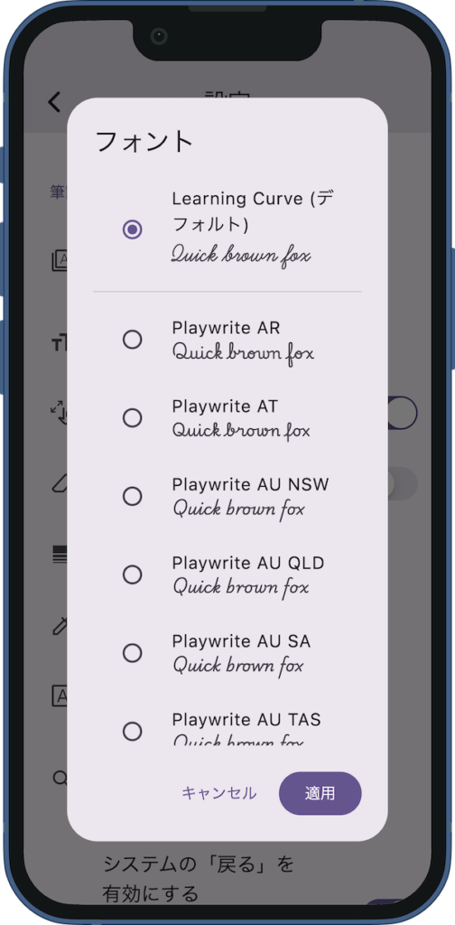 アプリの上部にある設定ボタンから設定画面を開き、筆記体設定の中にある「フォント」から、筆記体のフォントを選択できます。