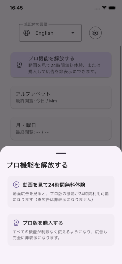 動画広告を見ると、プロ版の機能(単語・グループの管理、ペンの色、お手本切り替え)が24時間利用可能になります。