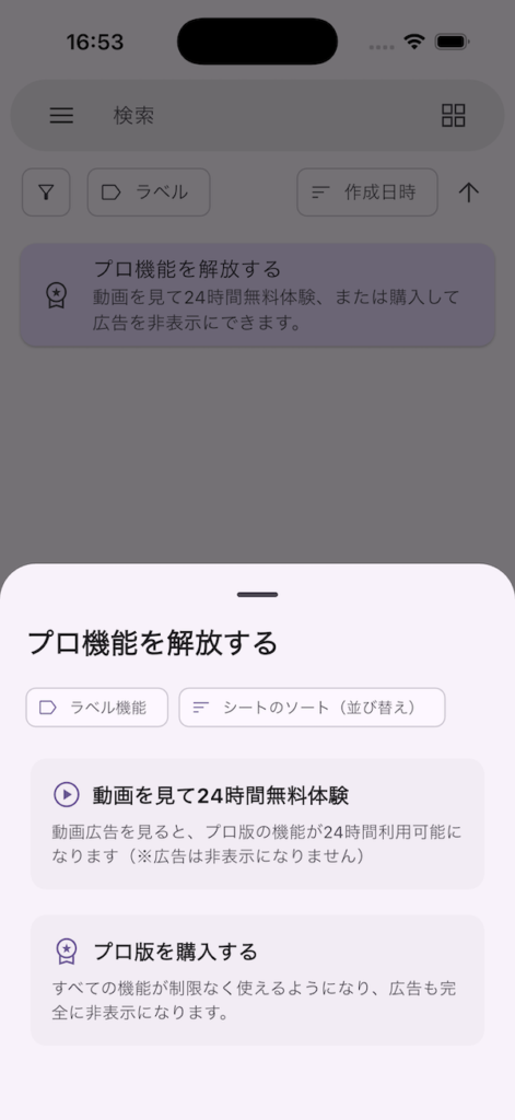 動画広告を見ると、プロ版の機能(ラベル機能、シートのソート)が24時間利用可能になります。