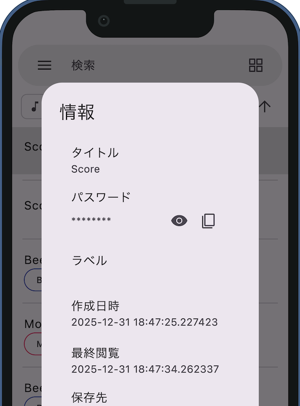 楽譜の情報では、パスワードが保存されているとパスワードの欄が表示されます。