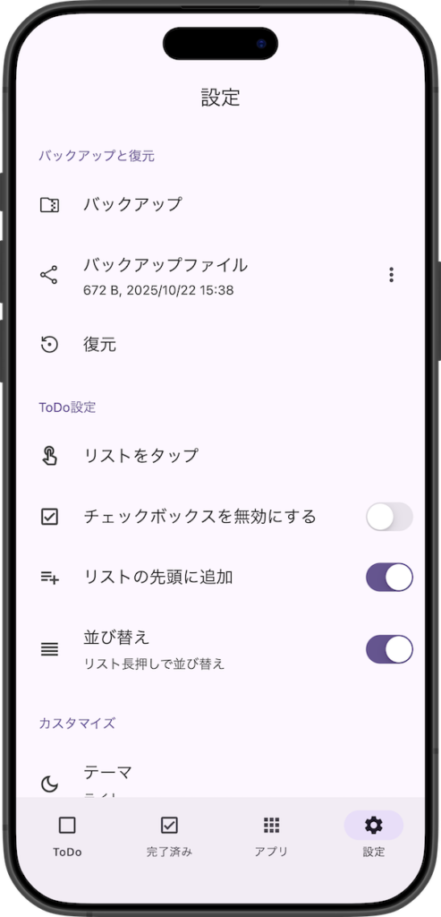 バックアップを一度作成すると、設定画面下部の「バックアップファイル」からいつでも共有できます。また、このバックアップファイルはアプリ内フォルダに保存されていますので、不要になった場合は右メニューから削除可能です。ただし、アプリを削除するとこのバックアップファイルも一緒に削除されるためご注意ください。
