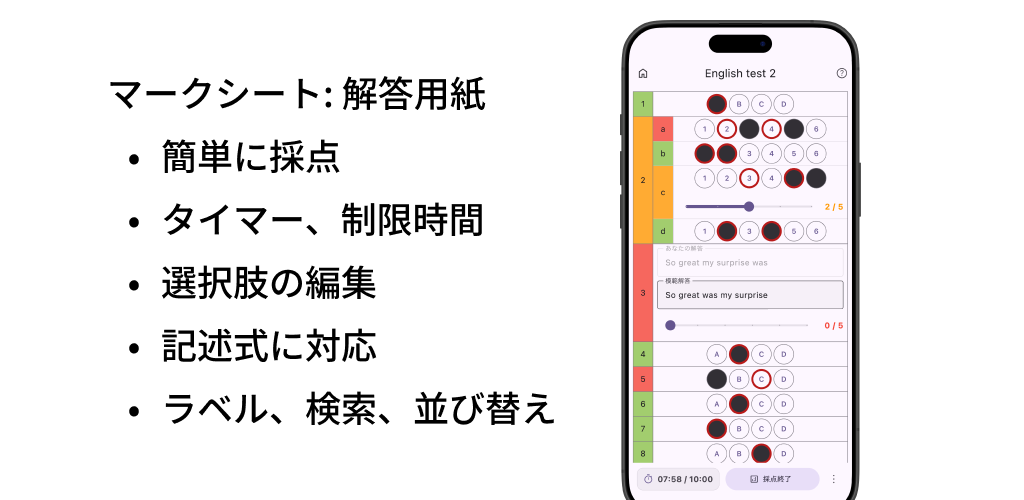 簡単に採点することができ、複数回答、小問、記述式にも対応しています。