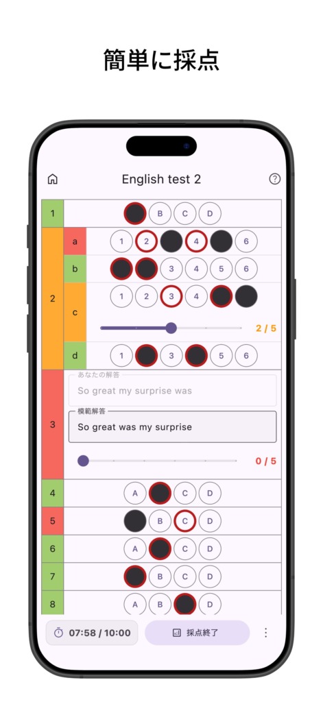 - 解答を終了すると採点モードになり、正答の選択肢をタップするだけで簡単に採点をすることができます。