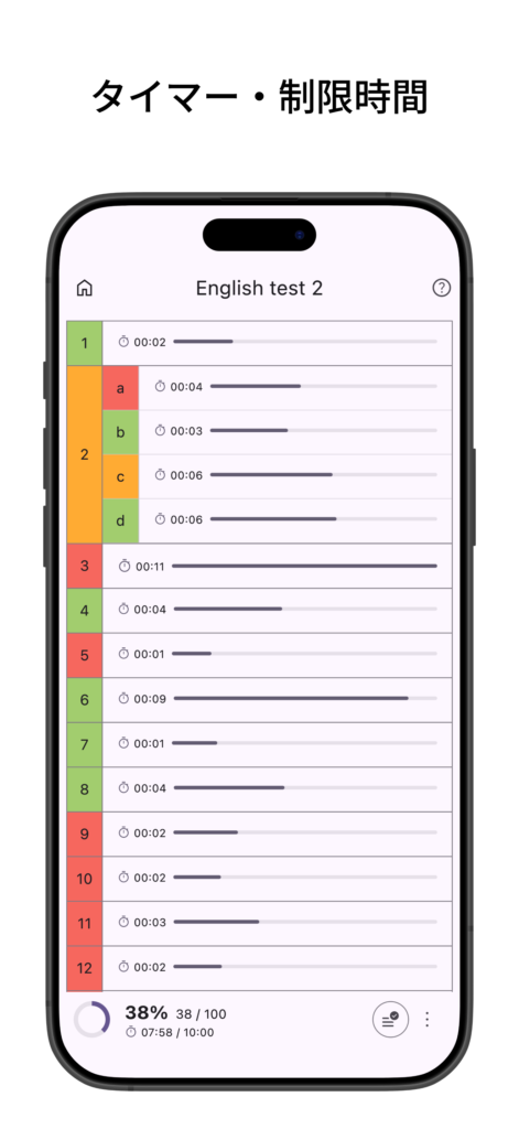 - タイマーを設定している場合、各問題に要した時間が記録され、採点終了後グラフで確認できます。