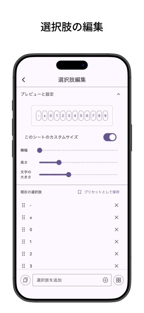 - 選択肢のプリセットを管理できます。マークのサイズも含め保存することもできます。