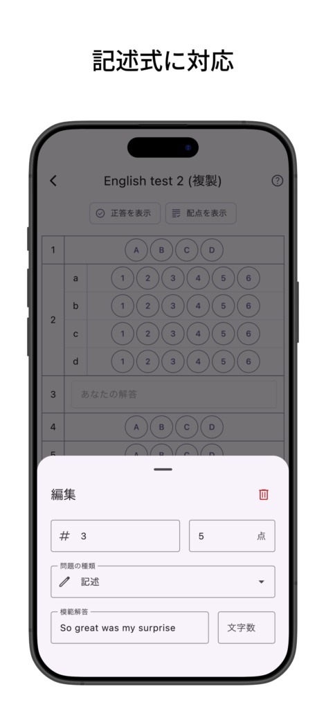 - 複数回答、小問、記述式にも対応しています。記述式では、文字数制限や模範解答を設定できます。