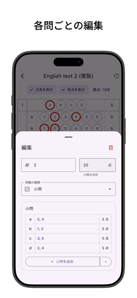 - 複数回答や記述式の場合、部分点を付与することもできます。