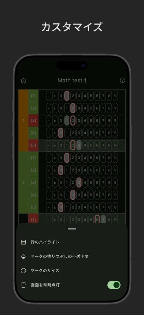 - 問題数、選択肢を設定できます。選択肢は自由に設定でき、マークサイズ(横幅、高さ、文字の大きさ)も変更できます。設定した選択肢をプリセットとして保存することもできます。