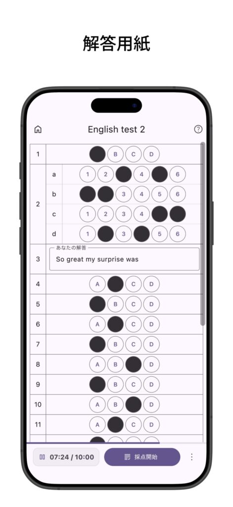 - 解答を終了すると採点モードになり、正答の選択肢をタップするだけで簡単に採点をすることができます。