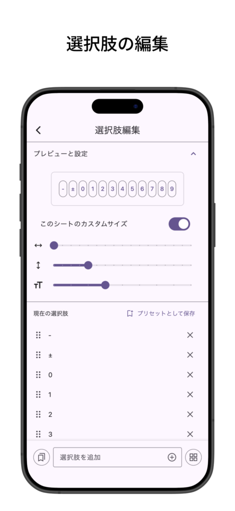 - 選択肢のプリセットを管理できます。マークのサイズも含め保存することもできます。