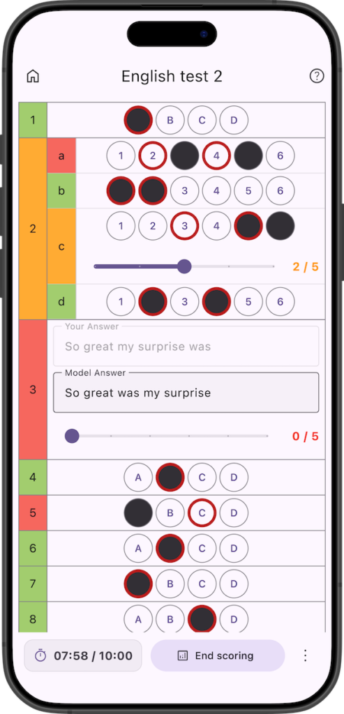 In the case of multiple answers, if the answer only partially matches the correct answer, a slider will appear allowing you to assign a score between 0 and (Allocated Points – 1). (The slider will not appear if the allocated point is 1).