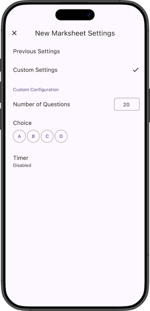 When creating a new marksheet, you can now configure the initial settings for the number of questions, choices, and timer. You can choose to inherit the settings from the last time you created a sheet (“Previous Settings") or use specific settings defined in the configuration (“Custom Settings").
