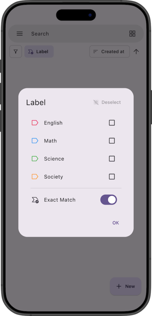 For example, if you turn on “Exact Match" while no labels are selected, only sheets with no labels attached will be displayed.