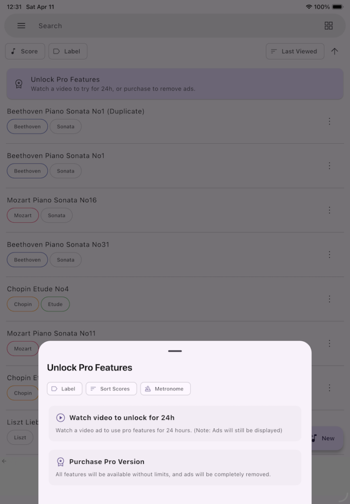 By watching a video ad, you can unlock and use Pro features (Label feature, Sort scores, and Metronome) for 24 hours.