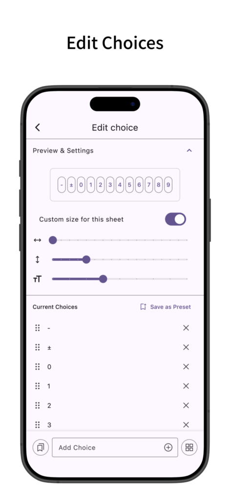 Manage choice presets. You can also save bubble sizes.